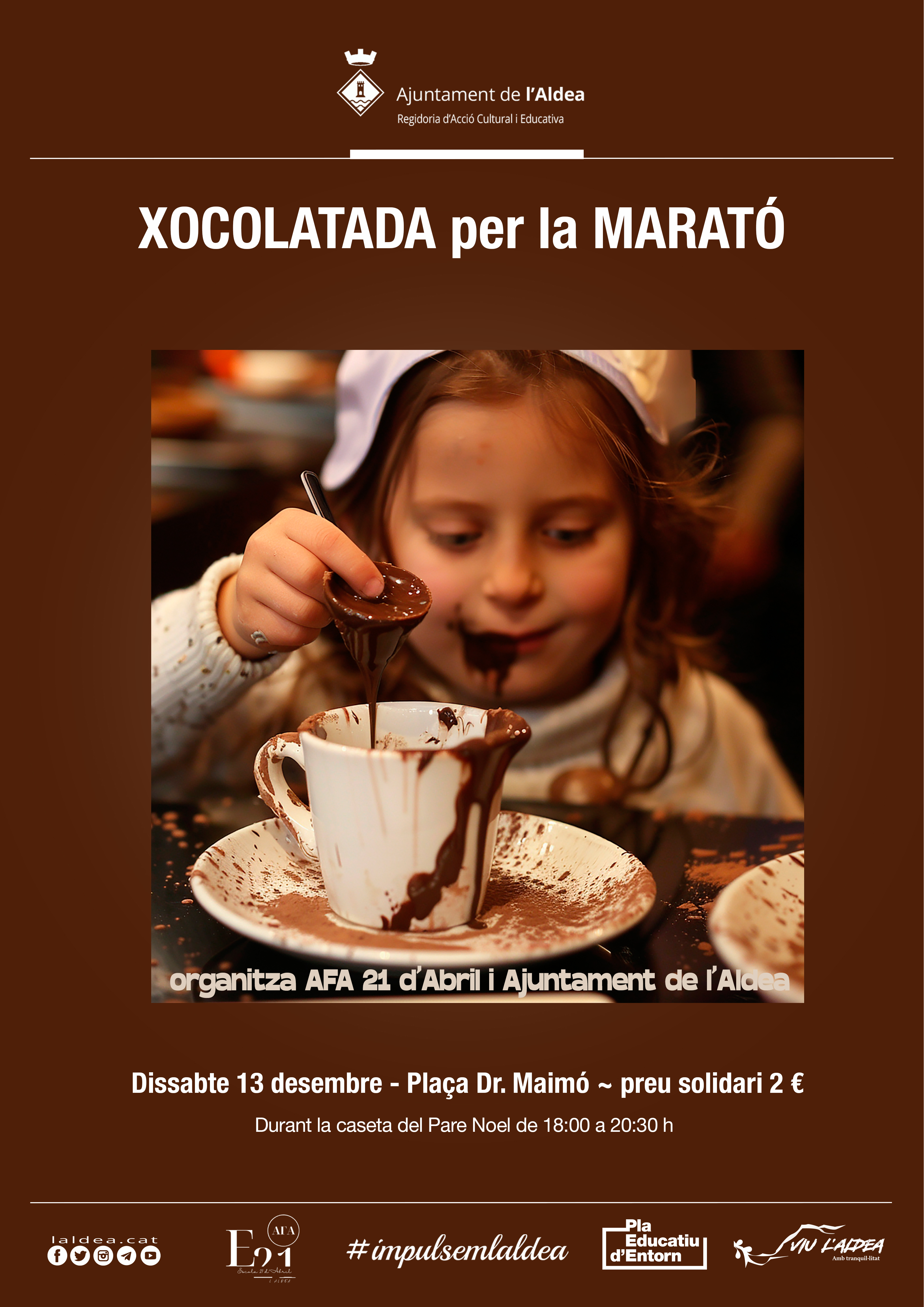 Aquest dissabte 13 de desembre us esperem a la Plaça Dr. Maimó, durant la caseta del Pare Noel, de 18:00 a 20:30 h, per gaudir d’una deliciosa xocolatada amb un objectiu ben especial: col·laborar amb La Marató.