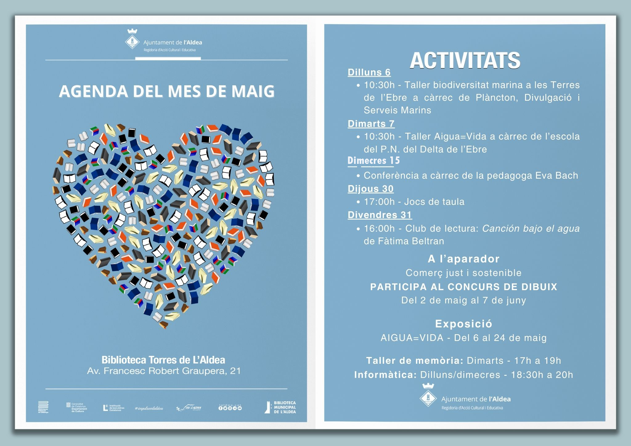 Agenda d'activitats del mes de maig a la Biblioteca Torres de l'Aldea.