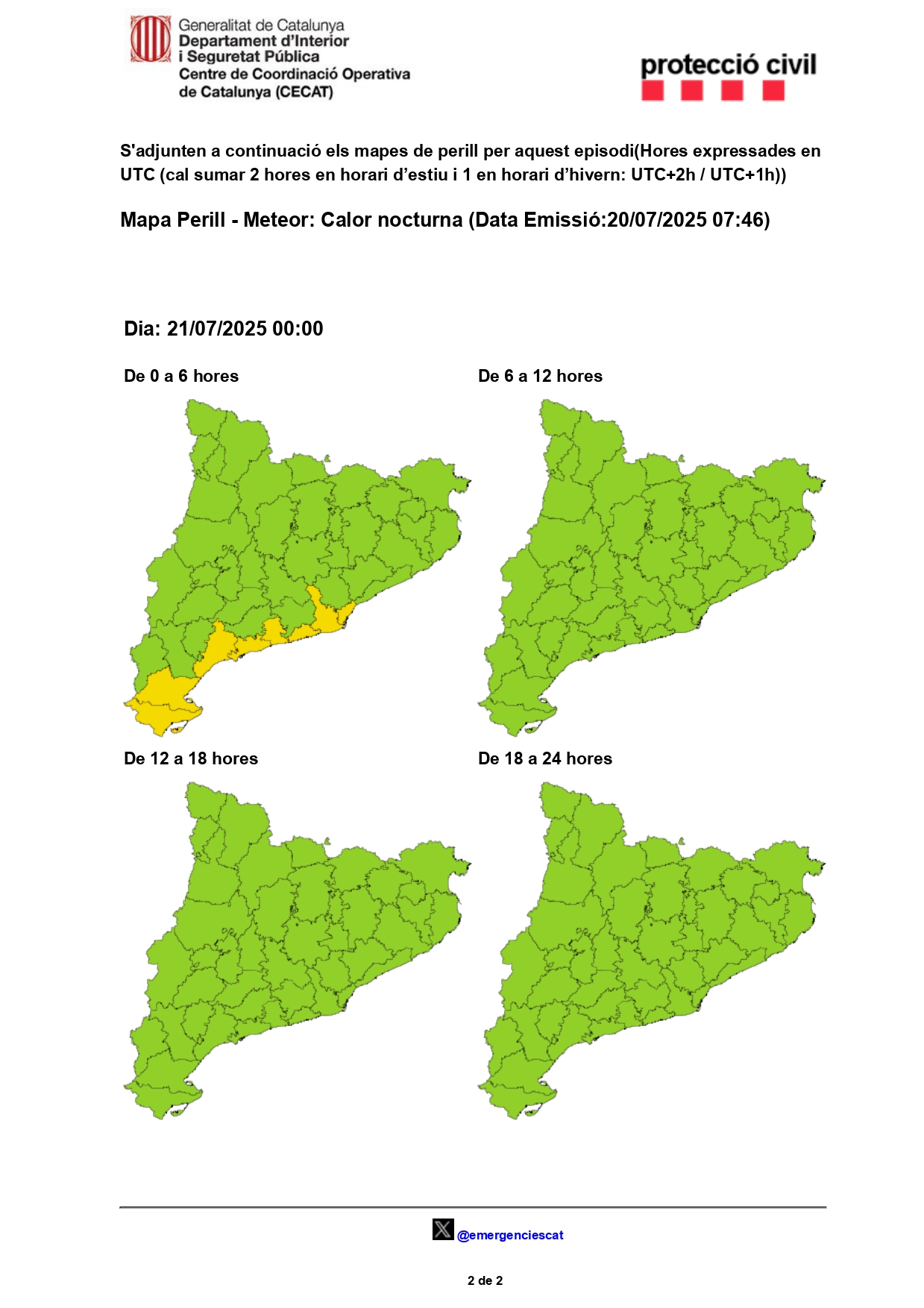 Es comunica que en base a les previsions meteorològiques emeses pel Servei Meteorològic de Catalunya i per les afectacions que es preveu que se'n poden derivar, correspon emetre un avís de risc per calor nocturna intensa.