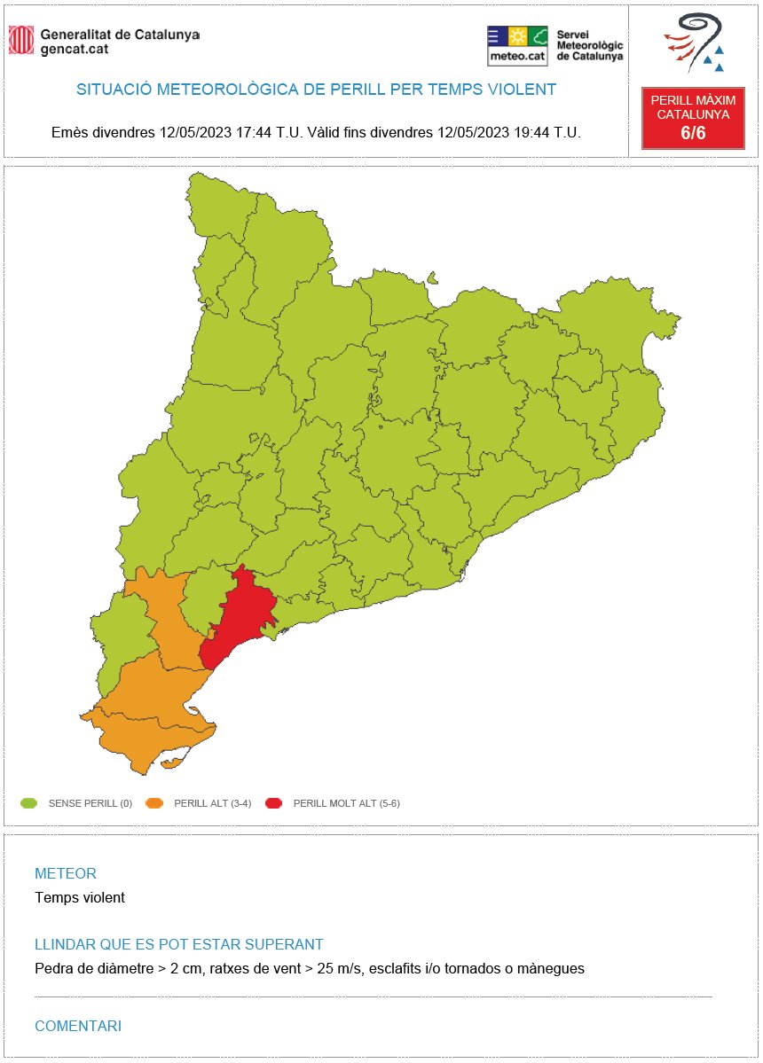 Possibilitat de pedra de diàmetre > 2 cm, ratxes de vent > 25 m/s, esclafits i/o tornados o mànegues.
