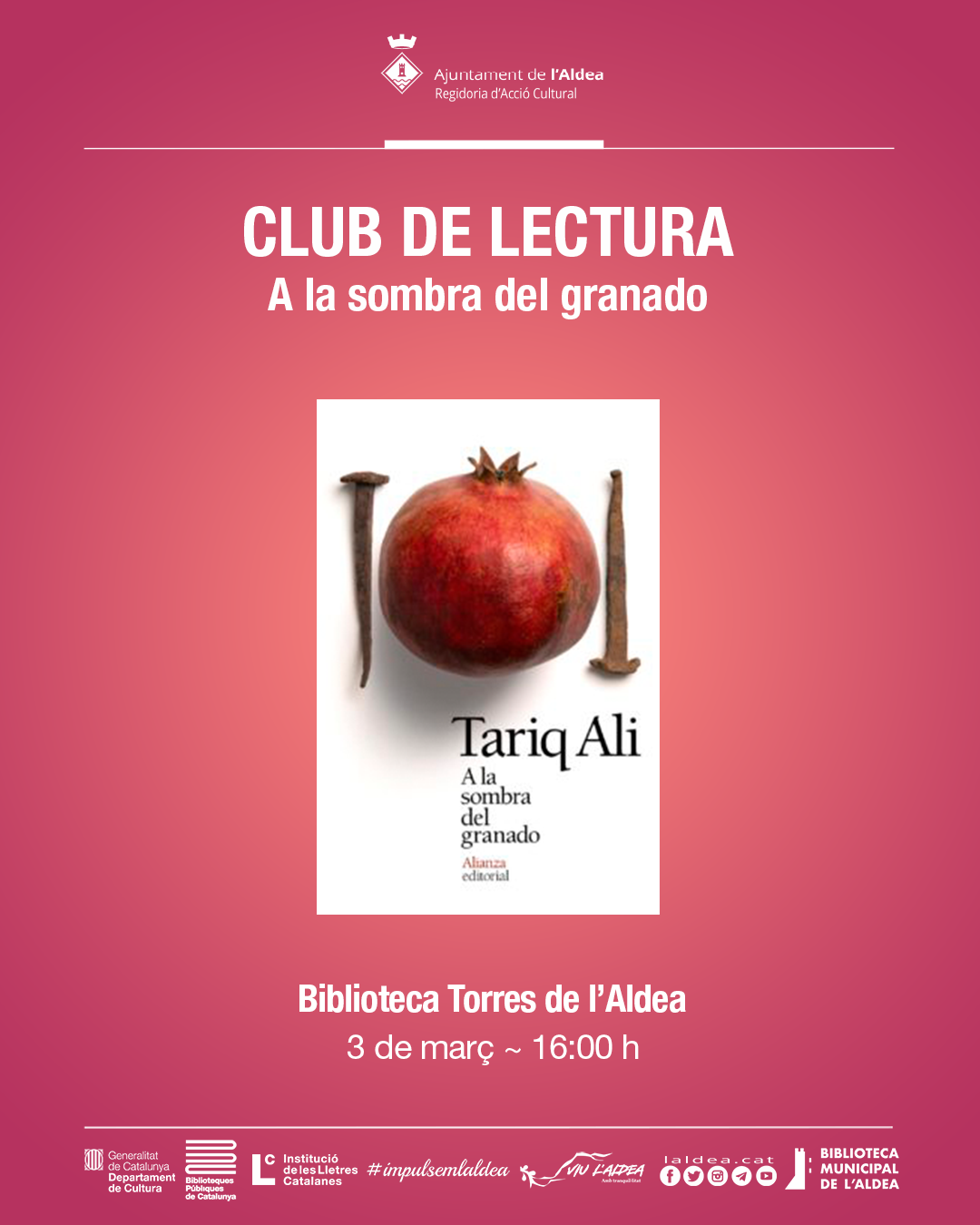 Si us interessa passar una bona estona xerrant i compartint experiències i sensacions sobre el llibre "A la sombra del granado" de Tariq Ali, us esperem el divendres dia 3 de març a les 16:00 h a la Biblioteca Torres de l’Aldea.