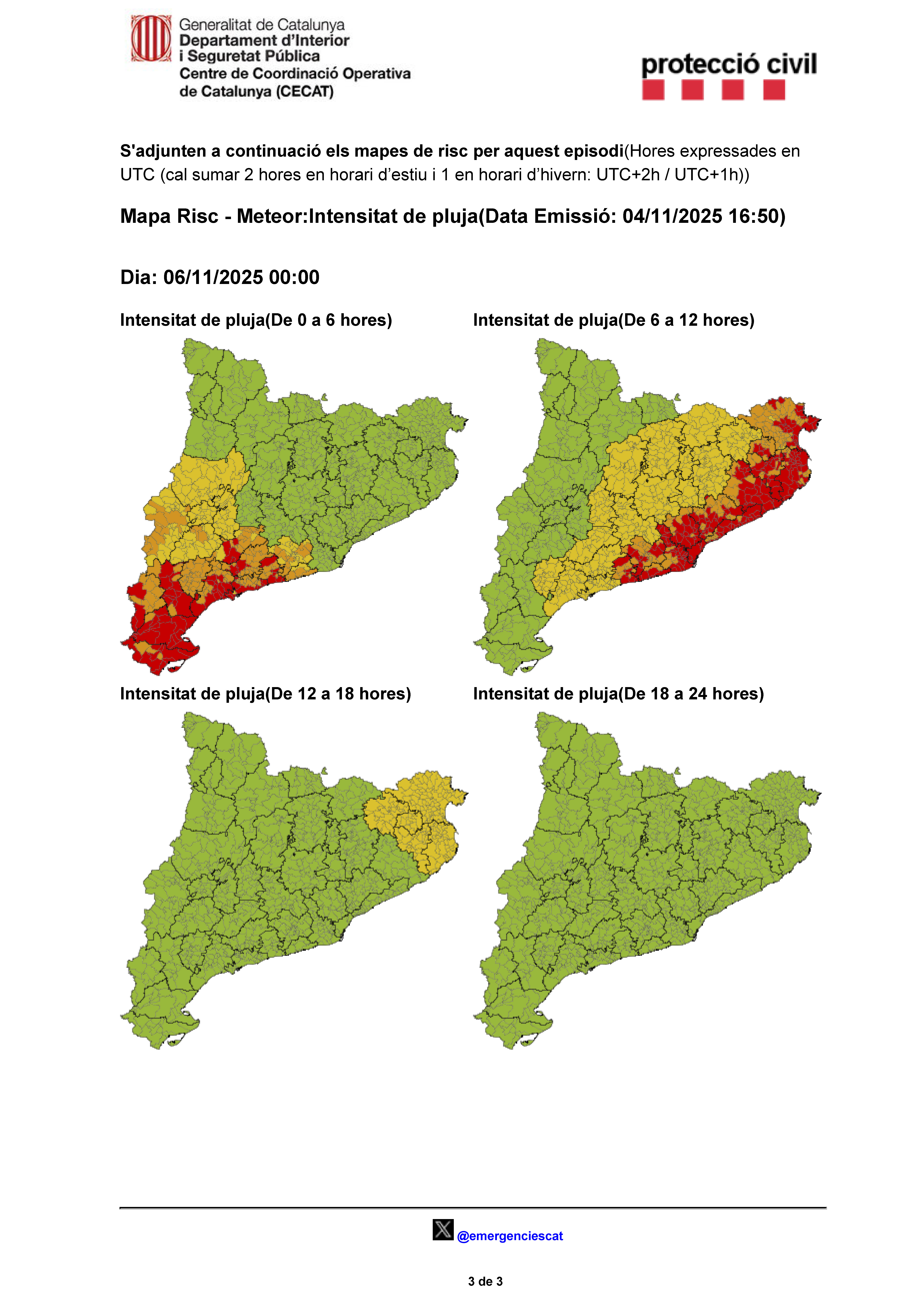 A partir de la matinada del dijous 6 de novembre començarà un episodi de pluja que s'allargarà fins al final de la tarda del mateix dia. L'episodi començarà per la zona sud i oest de Catalunya i s'estendrà durant el matí per la zona central i costa, fins a l'extrem oest. Es poden produir intensitats superiors als 40 mm en 30 minuts a totes les comarques de Terres de l'Ebre i a les comarques del Priorat, Baix Camp, Tarragonès i Alt Camp entre la 01:00 h i les 07:00 h. A la resta de comarques afectades i a la resta del dia es poden produir intensitats superiors a 20mm en 30 minuts. Les precipitacions poden anar acompanyades de tempesta.