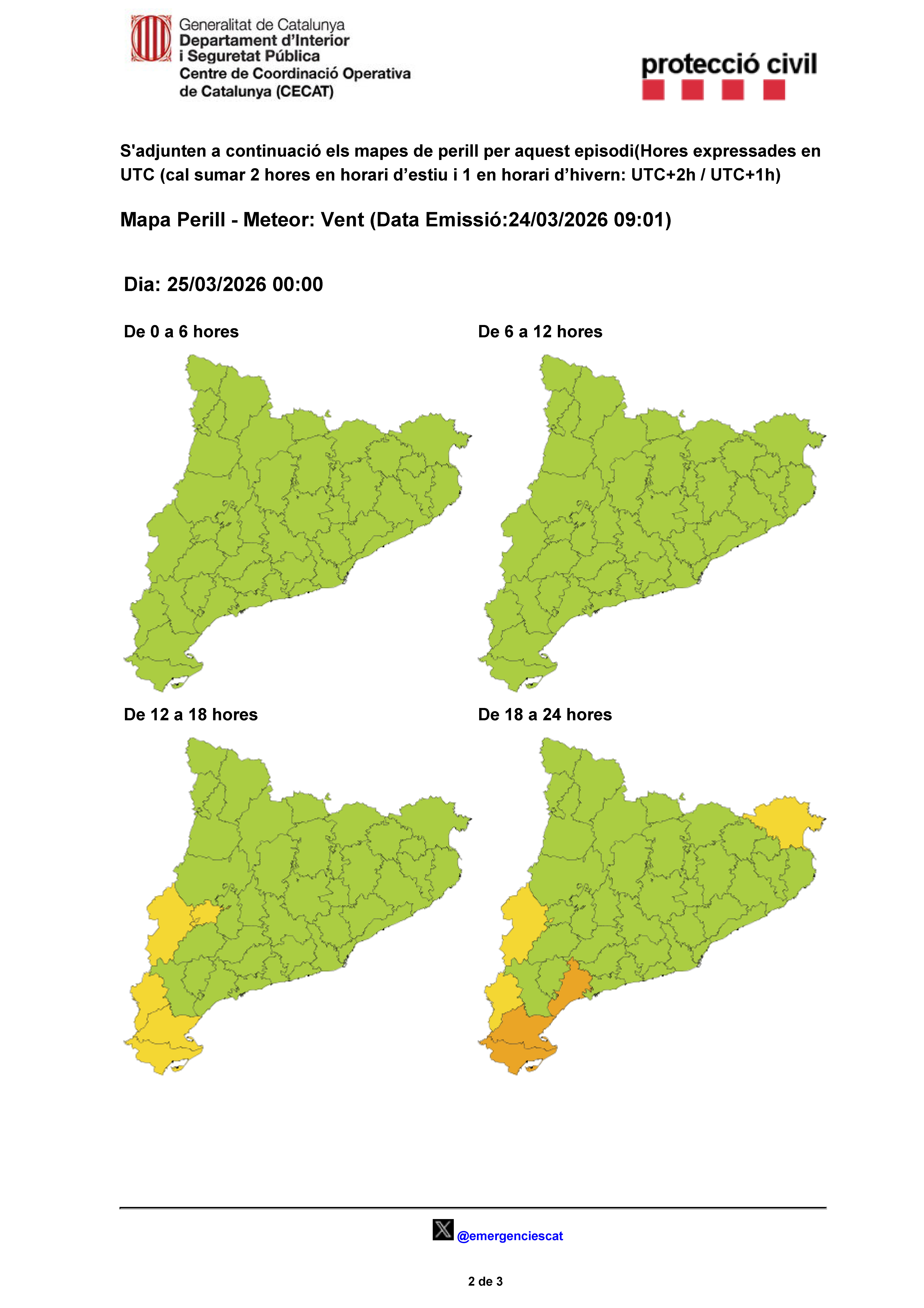 Es comunica que en base a les previsions meteorològiques emeses pel Servei Meteorològic de Catalunya i per les afectacions que es preveu que se'n poden derivar, s'ha activat el Pla especial d'emergències per risc de vent a Catalunya (VENTCAT) en fase d'ALERTA.