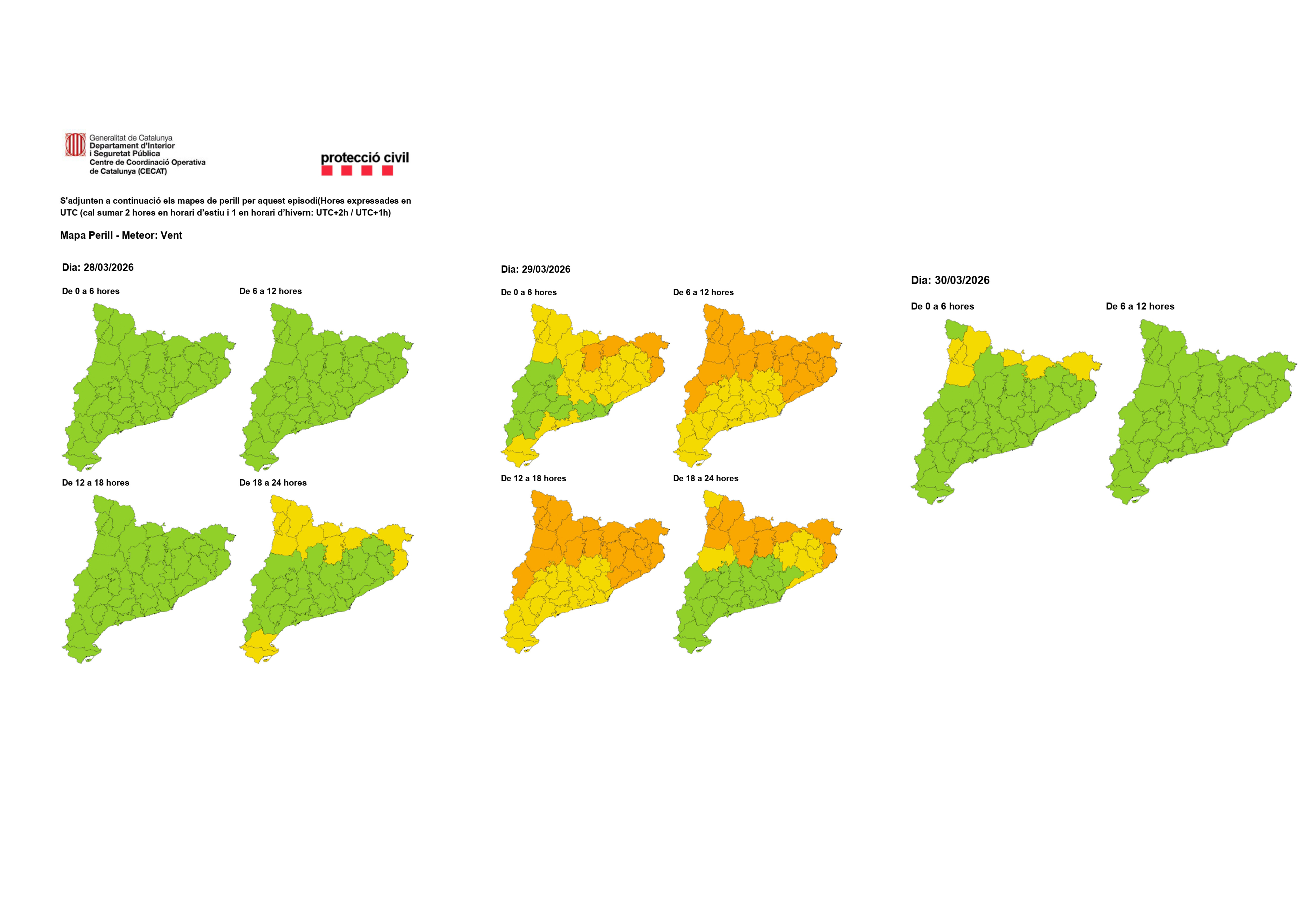 Es comunica que en base a les previsions meteorològiques emeses pel Servei Meteorològic de Catalunya i per les afectacions que es preveu que se'n poden derivar, es manté la fase d' del Pla Especial d'Emergències per risc de vent Catalunya (VENTCAT). Per avui, es mantenen les previsions de ratxes màximes de vent superior als 25 m/s al Pirineu i prepirineu. De cara a demà, diumenge, el fenomen s'intensificarà de forma generalitzada a tot el territori (previsions de ratxes màximes de vent superior als 25 m/s) amb una especial afectació al terç nord i est, concretament a les comarques de Alt Empordà, Alt Urgell, Alta Ribagorça, Baix Empordà, Berguedà, Cerdanya, Garrotxa, Gironès, Lluçanès, Maresme, Noguera, Osona, Pallars Jussà, Pallars Sobirà, Pla de l'Estany, Ripollès, Segrià, Selva, Solsonès, Val d'Aran i Vallès Oriental. Amb menor probabilitat, aquestes ratxes de vent també poden afectar a la resta de comarques de les demarcacions de Barcelona, Tarragona i Terres de l'Ebre.