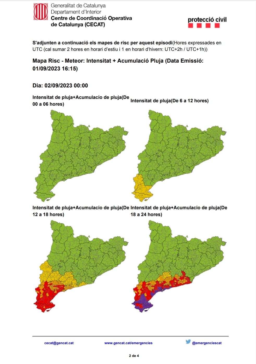 Segons informa el Servei Meteorològic de Catalunya (SMC), s'esperen precipitacions en forma de pluja que poden superar el llindar de 40 mm en 30 minuts a partir del matí de demà dissabte 2 de setembre i fins diumenge 3 de setembre a migdia a la meitat sud de Catalunya, a més del Segrià i Garrigues. Els xàfecs aniran acompanyats localment de tempesta. La distribució geogràfica del fenomen dins la zona avisada serà de caràcter local.