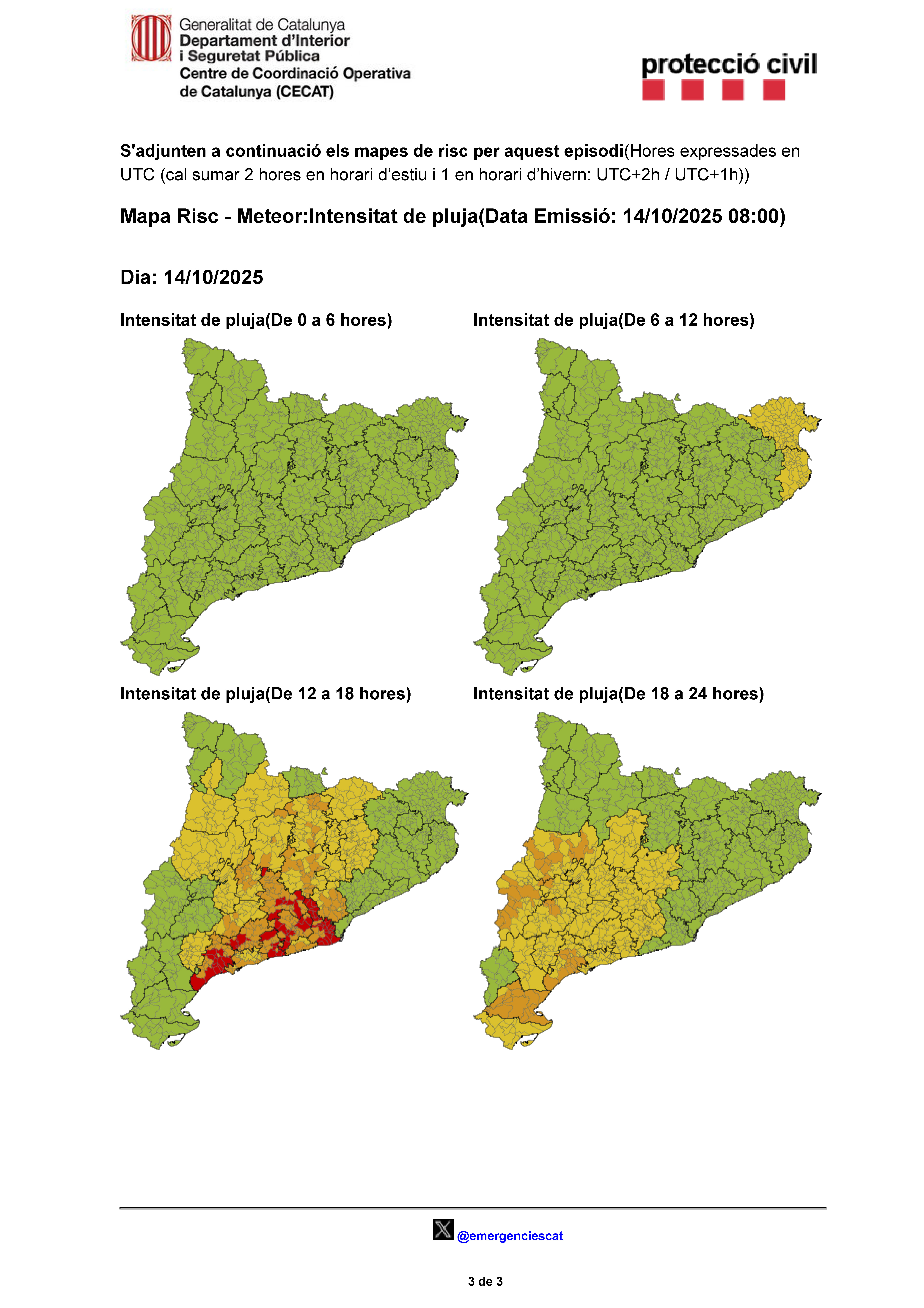 El Comitè Tècnic de seguiment del risc d'inundacions s'ha reunit a les 8:30h i ha decidit mantenir el nivell d'activació, a causa del nombre d'incidències registrades durant l'episodi de pluges i de les tasques de neteja i reparació que s'estan duent a terme a les Terres de l'Ebre. Es mantenen les restriccions a les comarques del Montsià, Baix Ebre, Ribera d'Ebre i Terra Alta. El Servei Meteorològic de Catalunya ha actualitzat els seus avisos. Pel que fa a l'acumulació, s'ha donat per finalitzat l'episodi. D'altra banda, pel que fa a la intensitat de pluja, es preveu que a partir del migdia es puguin superar els 20 mm en 30 minuts al litoral i prelitoral central, a la Catalunya Central i al Prepirineu, amb especial atenció a les comarques de l'Alt Camp, Alt Penedès, Anoia, Baix Camp, Baix Llobregat i Baix Penedès. Cap al vespre, les comarques del sud del país també s'afegiran a la zona avisada. La distribució geogràfica del fenomen dins aquesta zona serà de caràcter local, i els xàfecs podran anar acompanyats localment de tempesta.