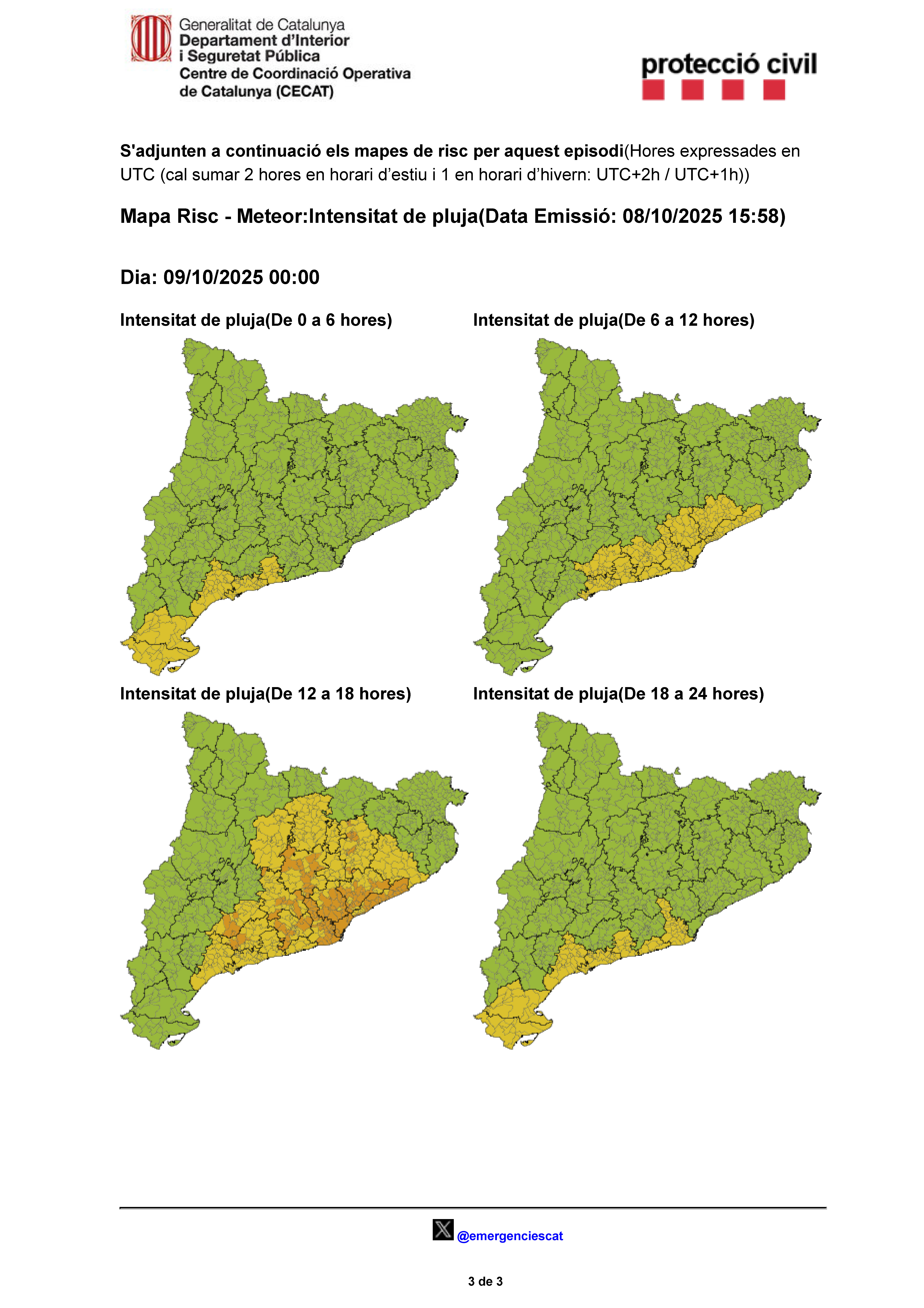 Segons el Servei Meteorològic de Catalunya a partir d'aquesta mitjanit i especialment demà dijous 9 d'octubre a la tarda es podria superar el llindar de 20 mm / 30 minuts a bona part del territori. Els xàfecs, que podrien anar localment acompanyats de tempesta, començarien pel litoral sud i s'anirien estenent cap al litoral central i interior del país. El fenomen es podria allargar fins la matinada de divendres, però ja amb menys probabilitat.