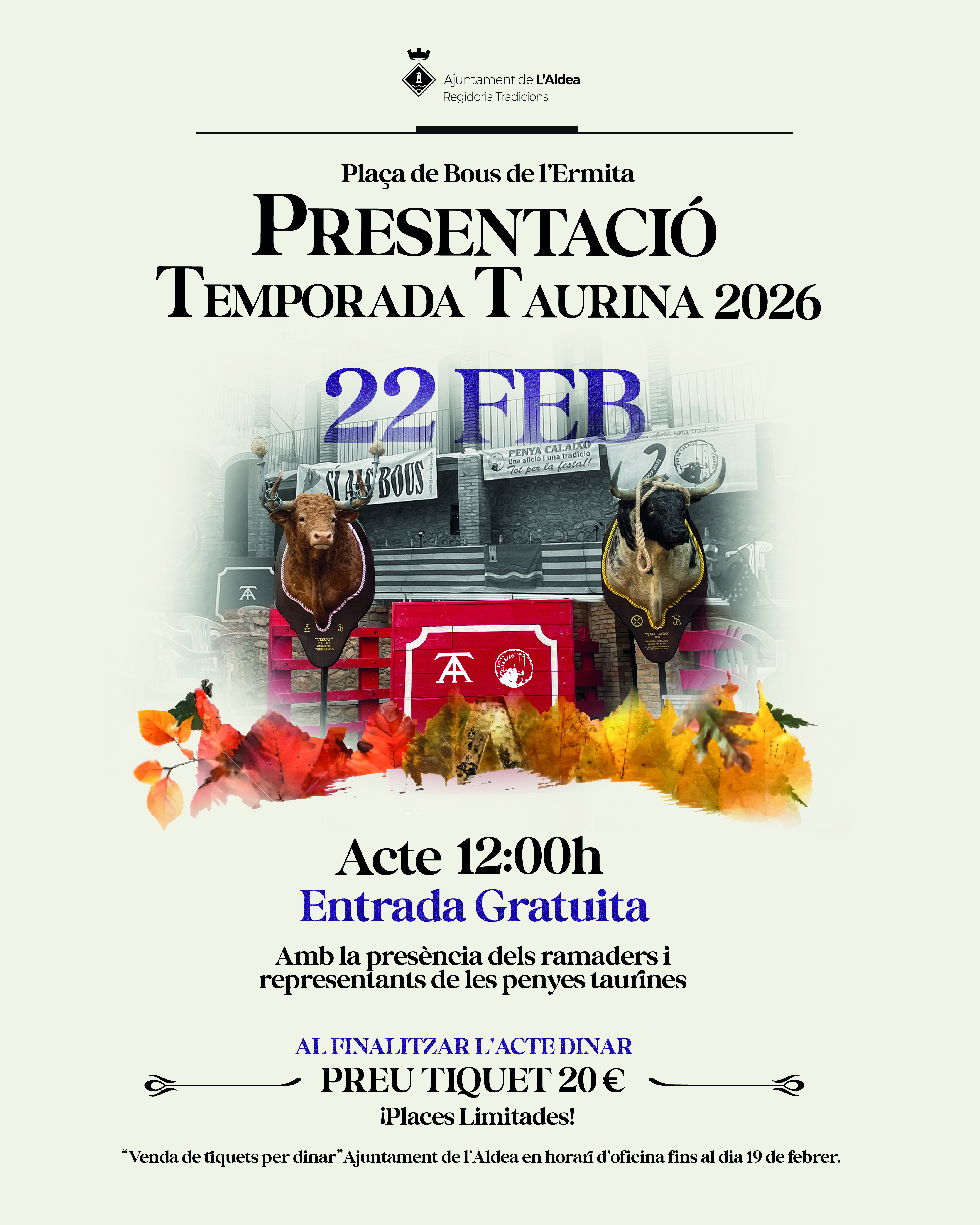Venda de tiquets per dinar a l’Ajuntament de l’Aldea, últim dia venda tiquets 19 de febrer.