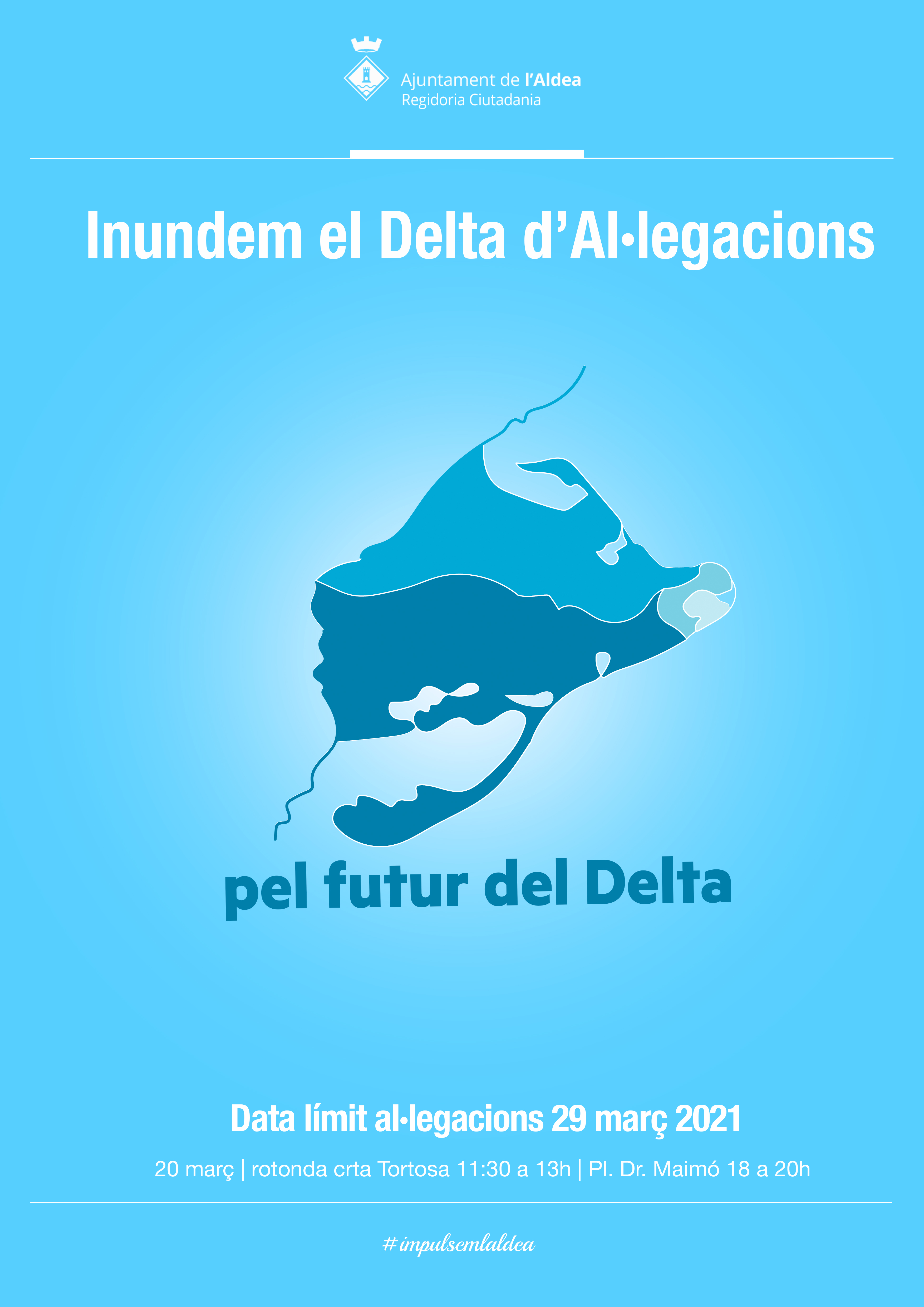 Al nostre web www.laldea.cat disposeu del model d’al·legacions per presentar contra el Pla de Protecció del Delta, el qual pretén que una gran part del Delta, quedi inundada per la Mar, afectant costes, zones naturals, sectors productius i edificacions. A més de poder-ho presentar telemàticament , i presencialment a l’Ajuntament, també per les tardes de dilluns a diumenges pots emplenar-les al Casal de Joves i la Biblioteca Municipal.