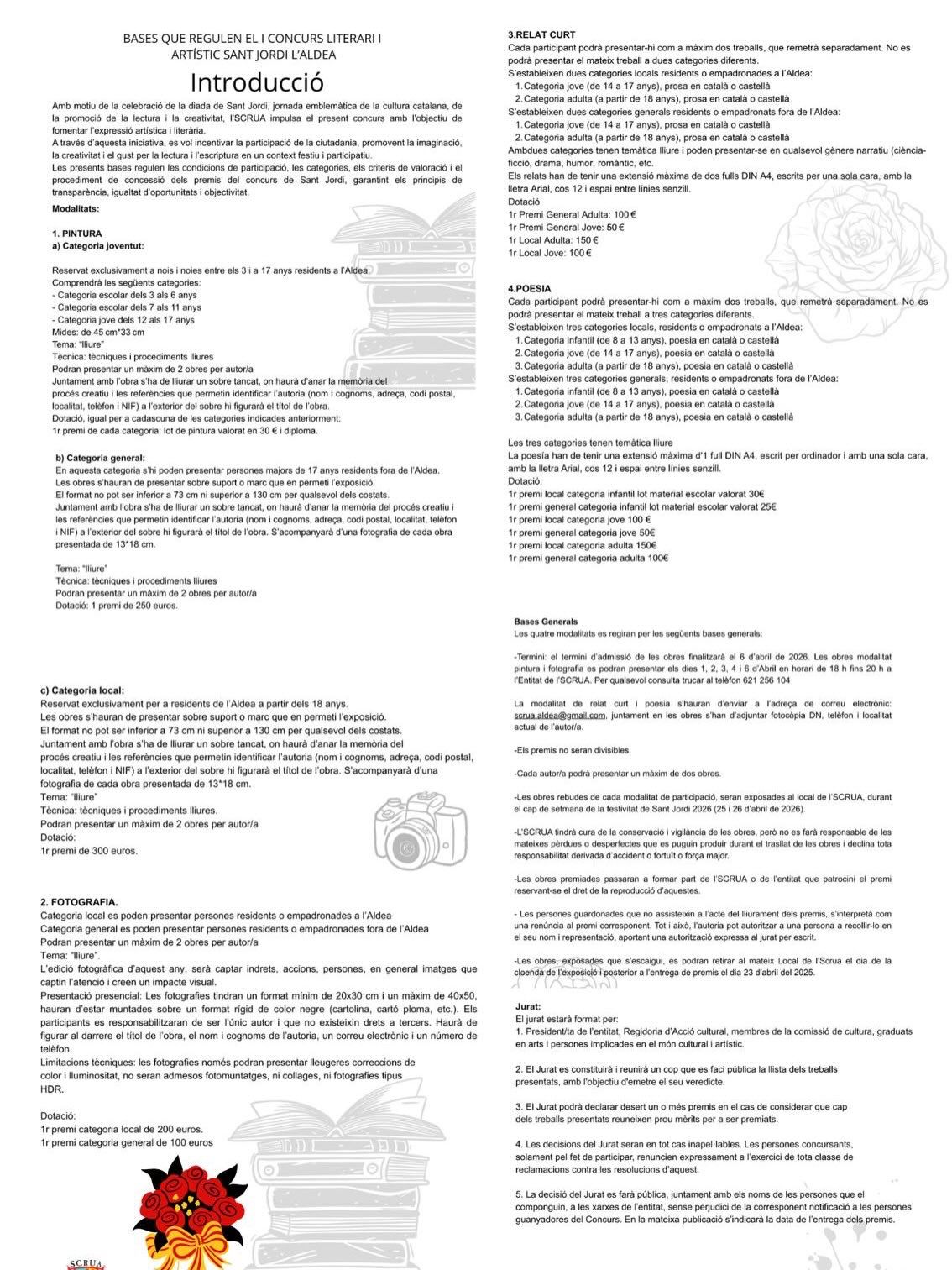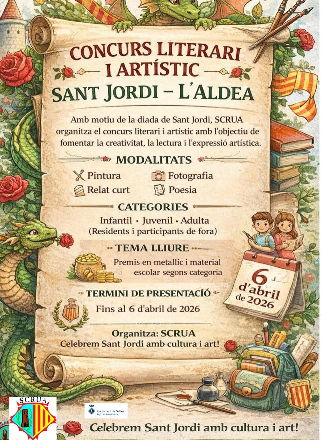 Amb motiu de la diada de Sant Jordi, SCRUA impulsa un any més el Concurs Literari i Artístic de l’Aldea, amb l’objectiu de fomentar la creativitat, la lectura i l’expressió artística entre totes les edats.