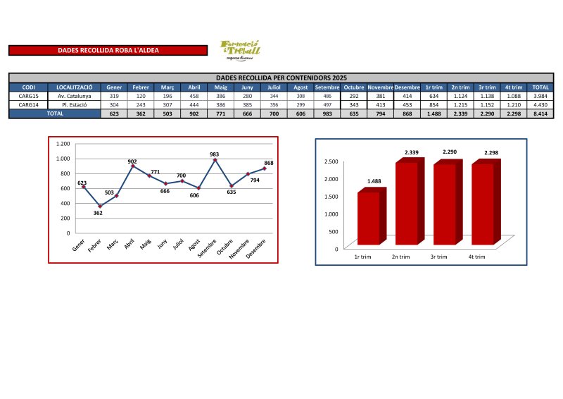 L’Ajuntament de L’Aldea en col·laboració amb Formació i Treball ha recollit 8.414 kg de roba de segona mà durant el 2025 a través dels 2 contenidors distribuïts pel municipi. Aquests quilos se sumen al total de 7.767.780 kg que l’entitat social ha recollit a Catalunya en el darrer any. La roba recollida s’envia a la planta de tractament de Sabadell, una de les més grans i avançades d’Europa, on es classifica per ser reutilitzada o bé es prepara per al seu reciclatge. Un 50% del tèxtil s’aprofita per a la venda solidària o Programes d’Entrega Social a través de les botigues Moda re-, així com per exportació internacional, per la seva alta capacitat d’acceptació de la roba de segona mà”. El 40%, que ja no es pot reutilitzar, s’introdueix en processos de preparació per al reciclatge avançats amb una tecnologia pionera d’espectroscòpia de l’infraroig proper (NIR), la qual permet la identificació precisa de la composició de les fibres de la roba i afavoreix el reciclatge de les fibres post-consum. El 10% restant és residu.
