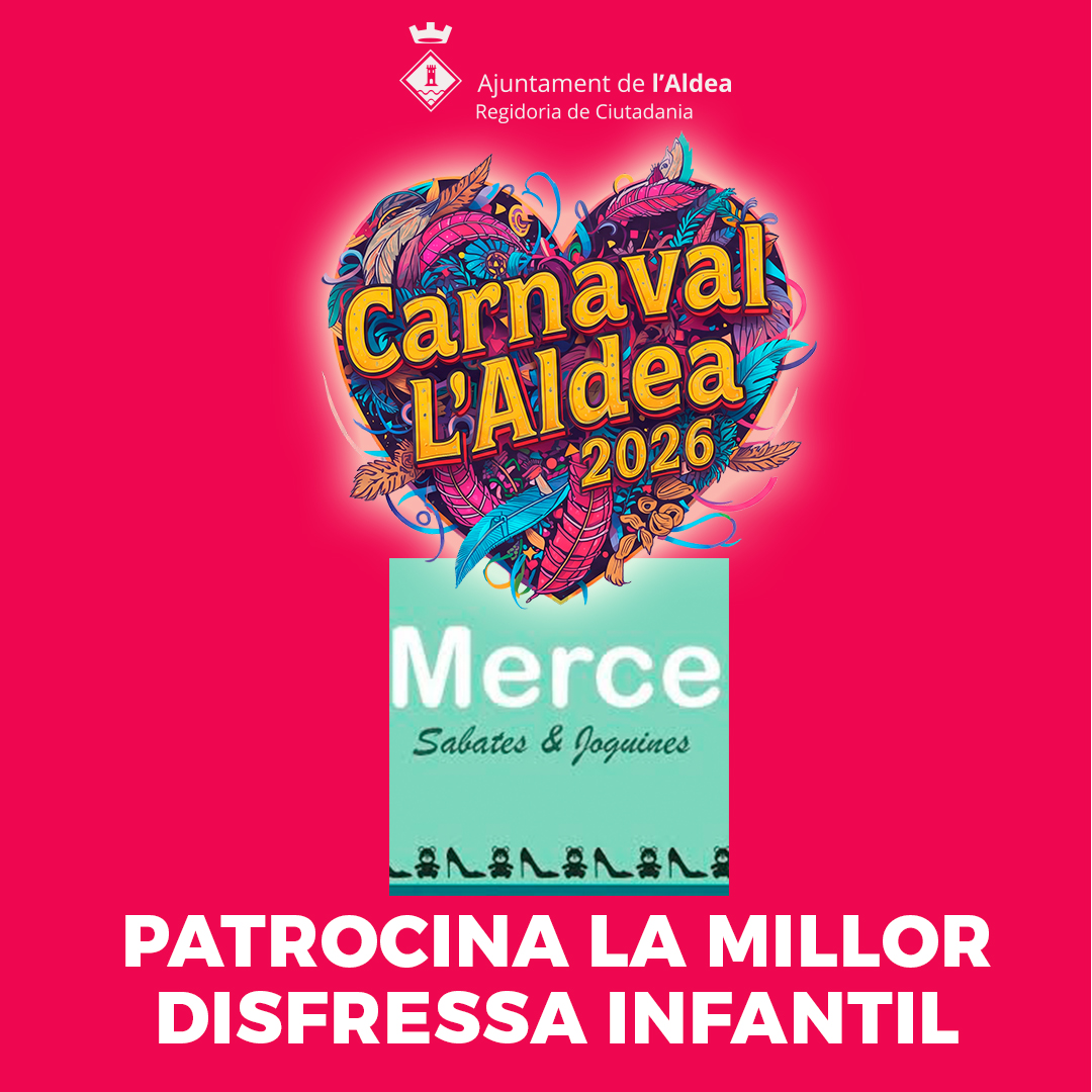 Sabates i Joguines Mercè patrocina un dels premis del Carnaval de l’Aldea 2026: el premi a la millor disfressa infantil (de 0 a 7 anys). La persona guanyadora rebrà un obsequi, que haurà de recollir-lo a la botiga.