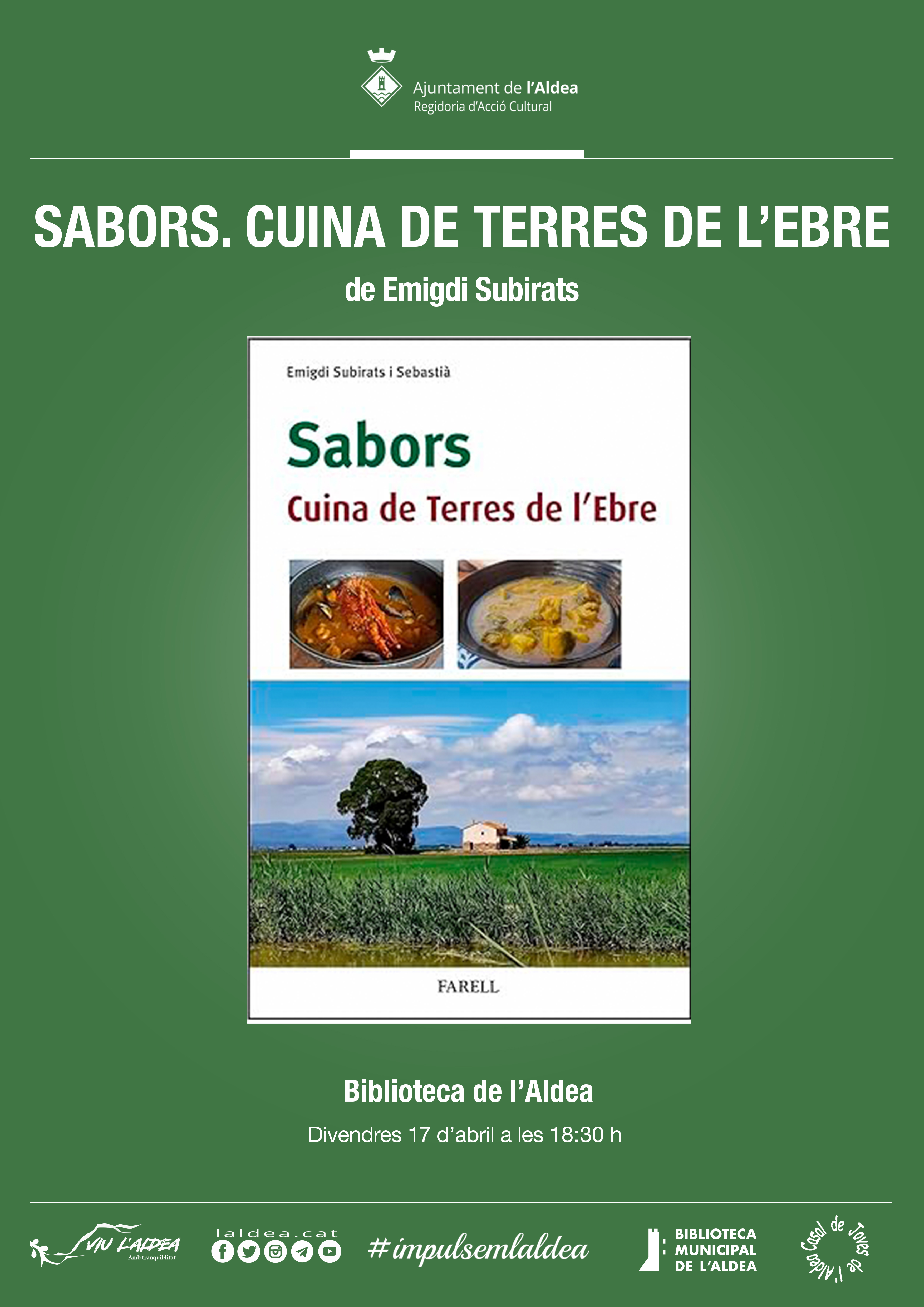 El proper divendres 17 d’abril, a les 18:00 h, presentarem Sabors. Cuina de Terres de l’Ebre de Emigdi Subirats, un llibre que mostra la gran diversitat i riquesa gastronòmica del nostre territori, posant la mirada en la cuina i els plats tradicionals. A més, inclou records i receptes dels ingredients que s’utilitzaven a casa seva.