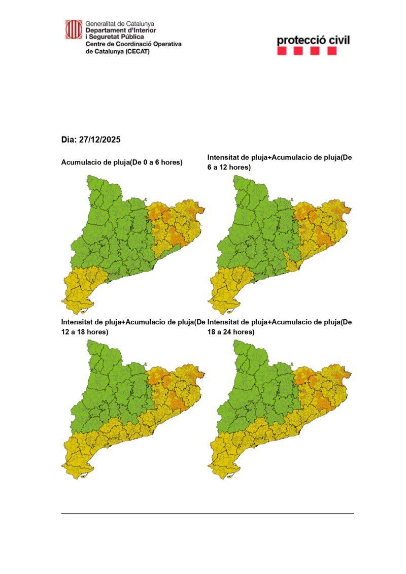 El Servei Meteorològic de Catalunya (SMC) ha actualitzat la previsió meteorològica. Es manté la previsió de precipitacions intenses durant el dia d'avui, especialment a les comarques del prelitoral i litoral, on es podrien superar els 20 mm en 30 minuts a l'acumulació, durant el dia d'avui, es podran superar els 200 mm en 24 hores . Pel que fa a zones de l’extrem nord-est del territori i al llarg de tot l'episodi localment es podrien arribar a fregar o superar els 300 mm. Al terç sud és possible que se superi el llindar de 100 mm en 24 hores a zones de muntanya.