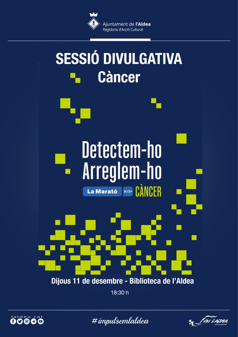 Aquest dijous 11 de desembre a les 18:30h, a la biblioteca de l’Aldea, tindrem una sessió divulgativa a càrrec de La Fundació de La Marató sobre el tema d’aquest any, el càncer.
